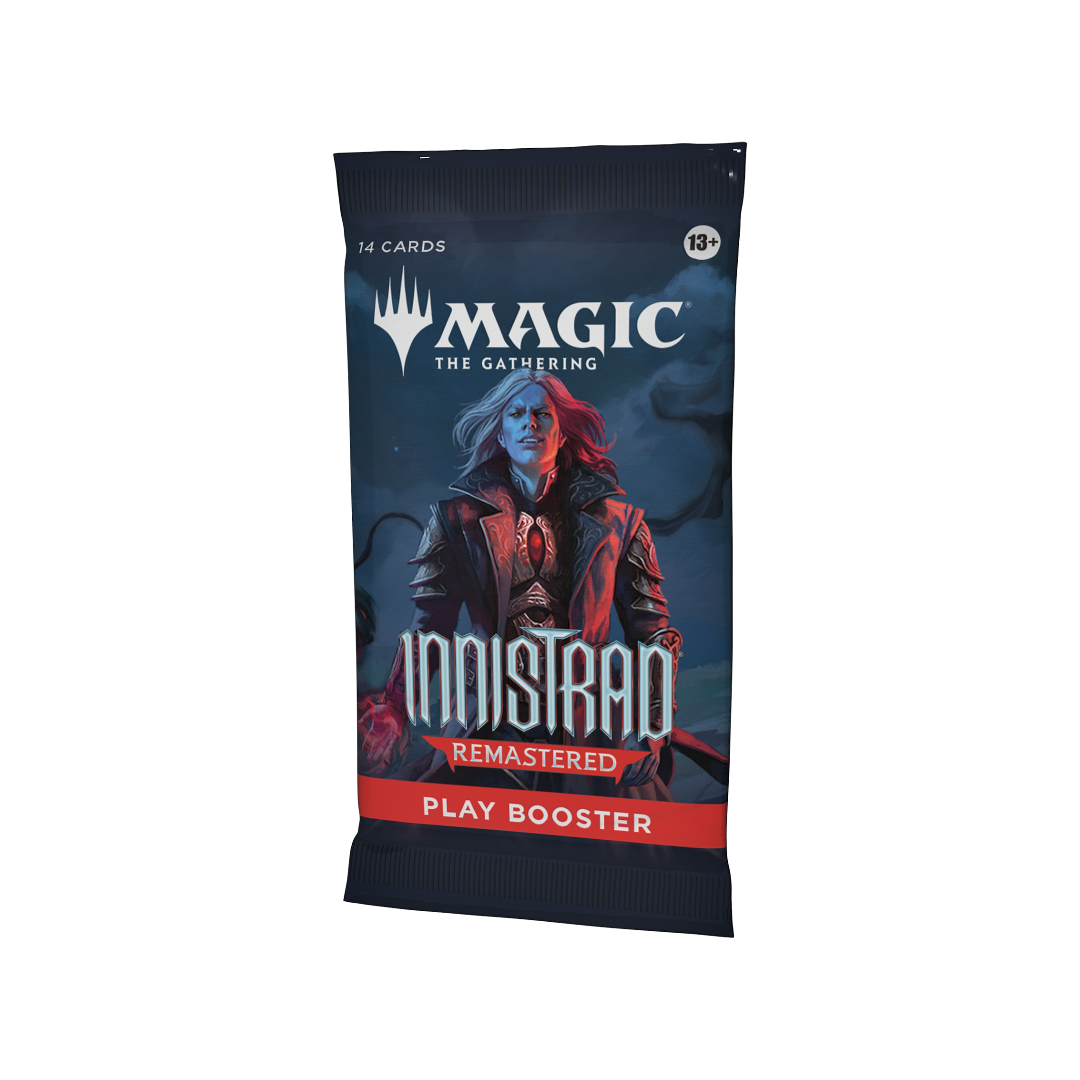 Sink your teeth into the very best of Magic’s spookiest gothic horror setting and rediscover everything you love to fear. This Innistrad Remastered Play Booster contains 14 Magic: The Gathering cards and 1 Token/Ad card, Helper card, or Art card, including 1–4 cards of rarity Rare or higher and 3–6 Uncommon, 6–9 Common, and 1 Land cards. Each Play Booster arrives nostalgia-packed with a Retro-frame card and 1 card of any rarity is Traditional Foil. Foil Borderless Mythic Planeswalker in <1% of boosters. Traditional Foil Land replaces a Land in 20% of boosters.