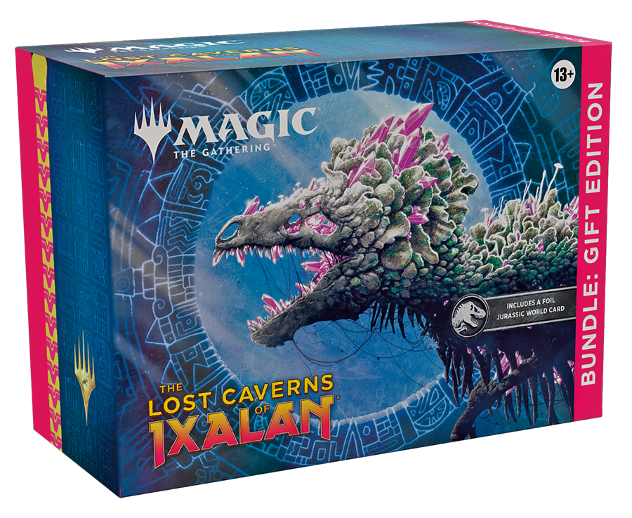 Dive head-first into The Lost Caverns of Ixalan with this deluxe bundle that includes a Collector Booster filled with premium treasures. It’s the perfect gift for the ultimate Magic fan in your life, especially if that fan is you. The Lost Caverns of Ixalan Bundle: Gift Edition contains 1 The Lost Caverns of Ixalan Collector Booster, 8 The Lost Caverns of Ixalan Set Boosters, 1 Traditional Foil Universes Beyond Jurassic World Collection card, 40 basic lands (20 Traditional Foils and 20 nonfoils), 1 exclusive oversized Spindown life counter, 1 foil card storage box, and 2 reference cards.