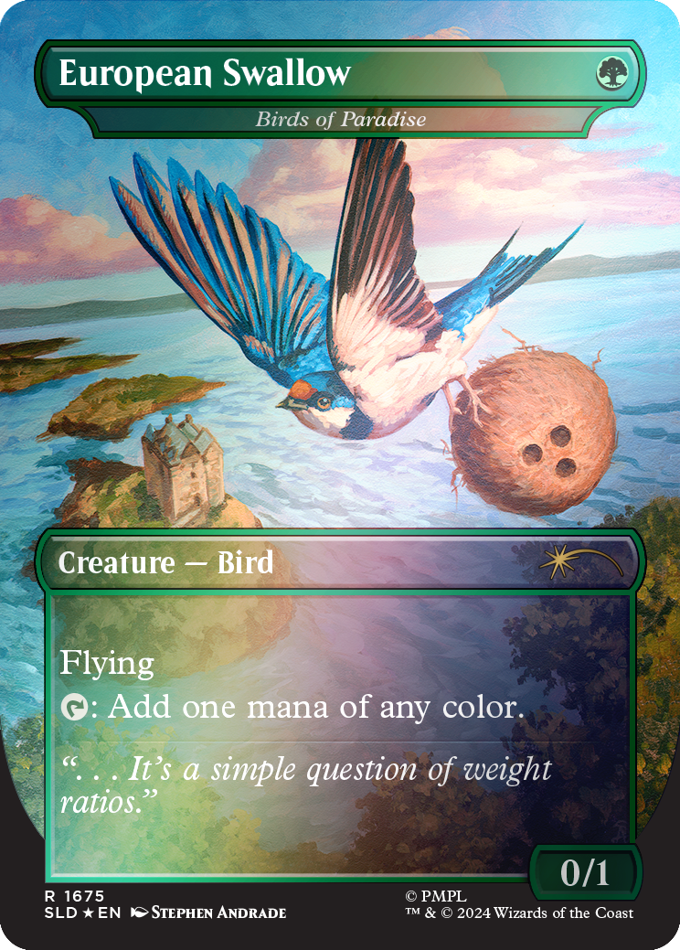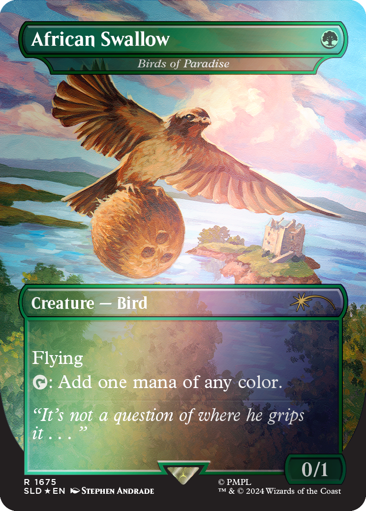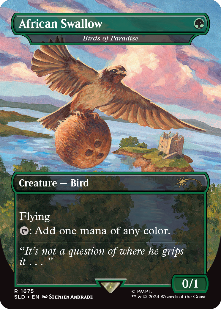 Five decades ago King Arthur and the Knights of the Round Table set off on a sacred quest to reclaim the Holy Grail. They… still haven’t found it. But they stopped by Secret Lair and told us all about their escapades, immortalized in Monty Python and the Holy Grail. Go watch it! We liked it so much that we made two drops inspired by it. This drop even has a double-sided Birds of Paradise that lets you choose between an African and European Swallow. How do we know so much about swallows? Well you have to know these things when you're a king.