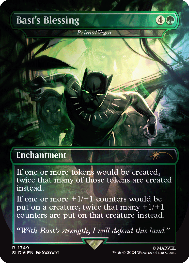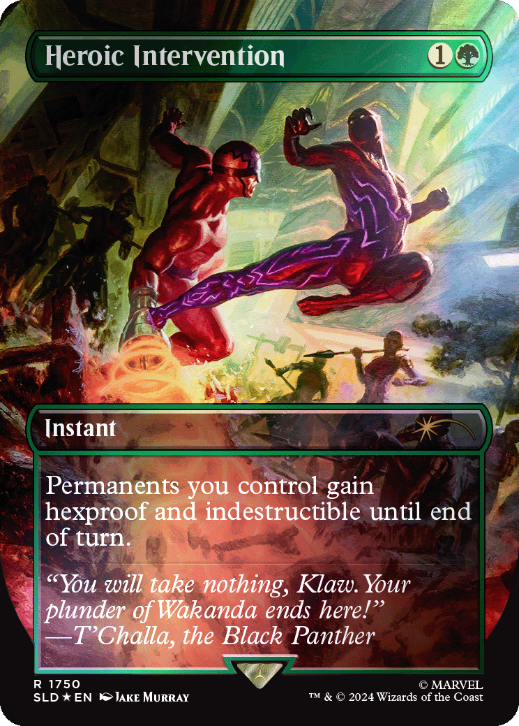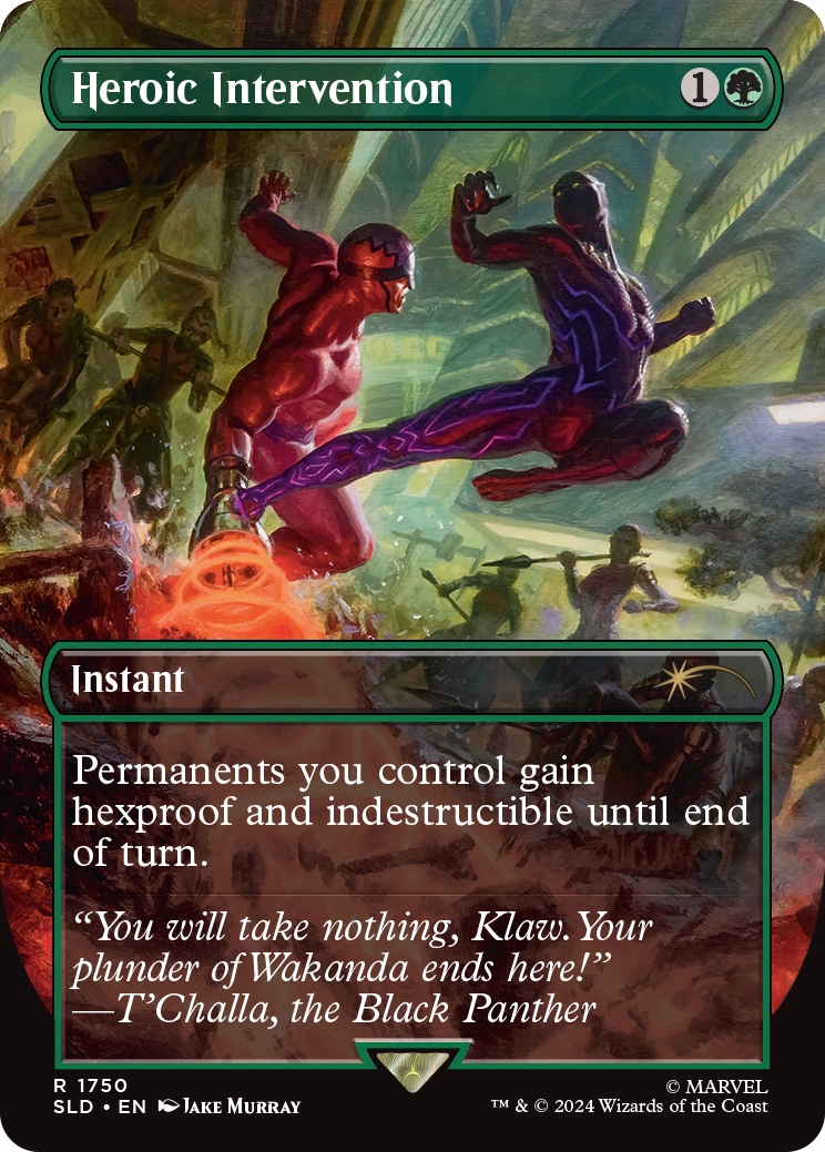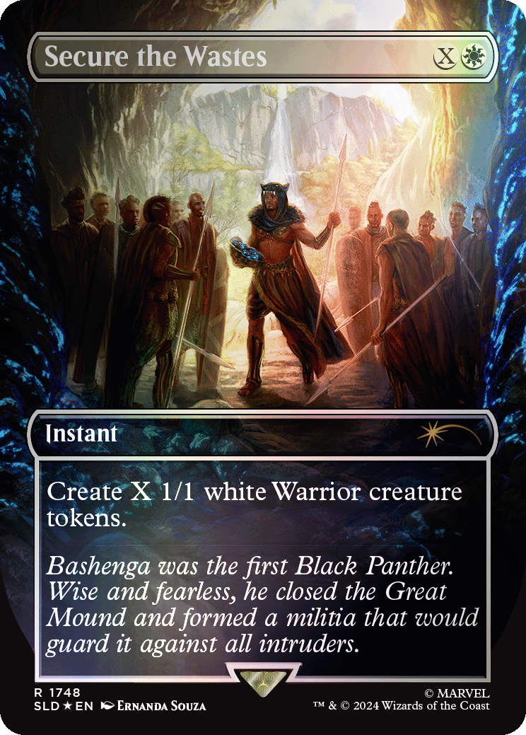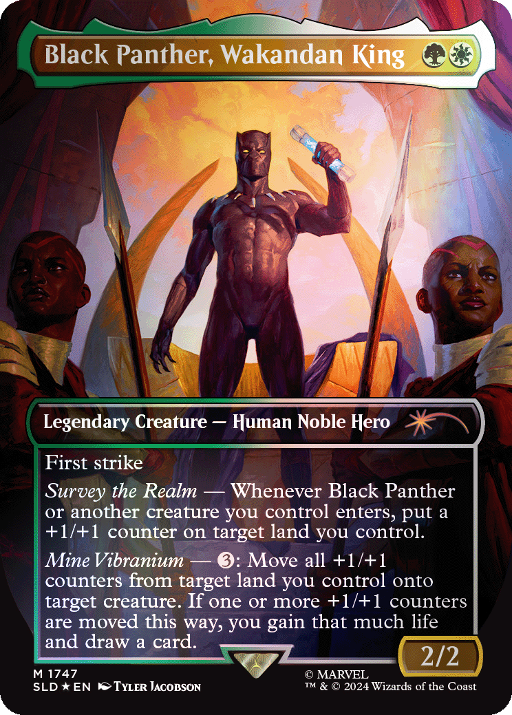 Leaping from the heart of Wakanda into the depths of Secret Lair, Black Panther is on the prowl. Featuring the alter ego of warrior king T’Challa, this drop brings the power of Vibranium to bear across five majestic cards, including an all-new legendary Black Panther, Wakandan King. Protect your people, punish your enemies, and preserve your position as commander and king.