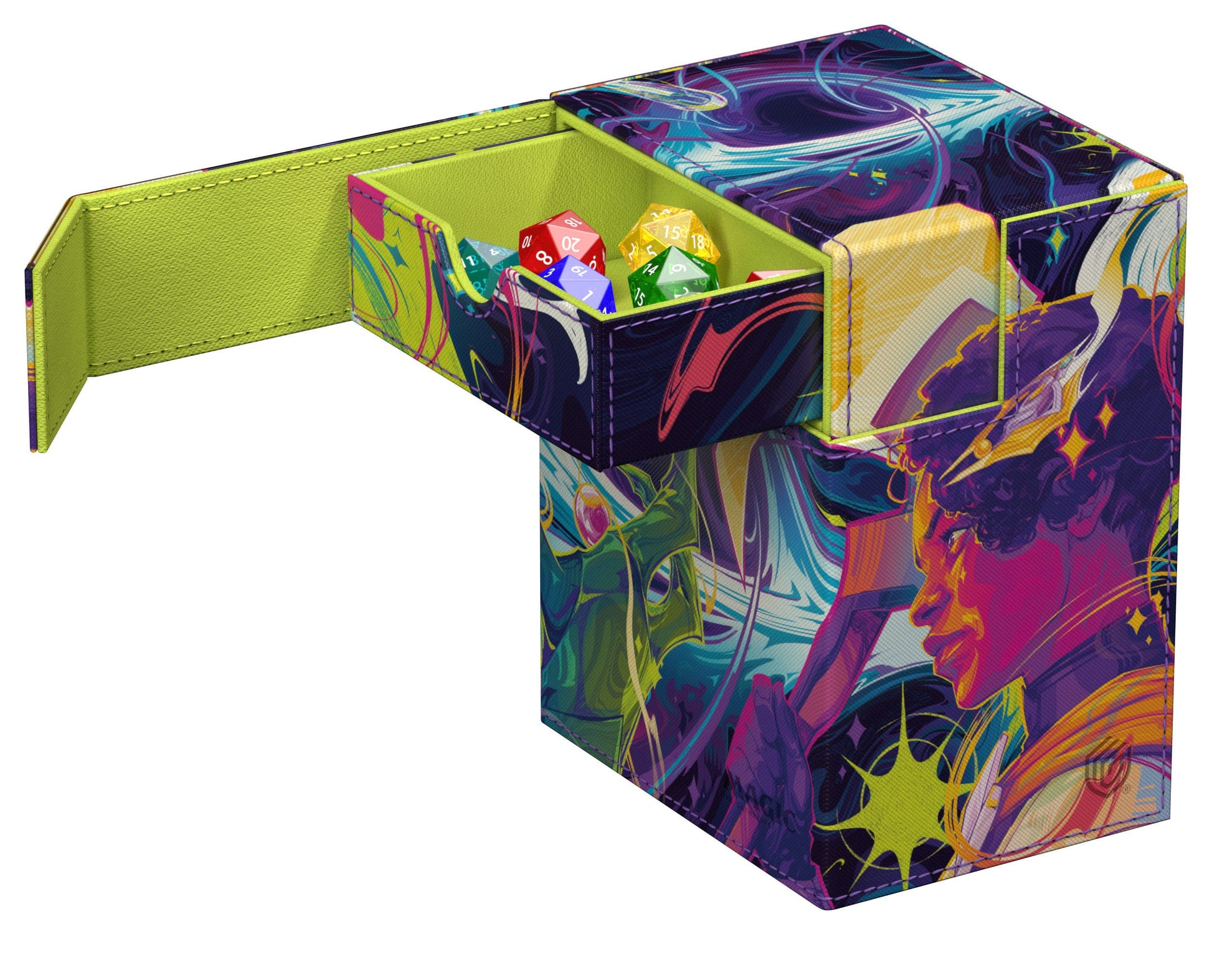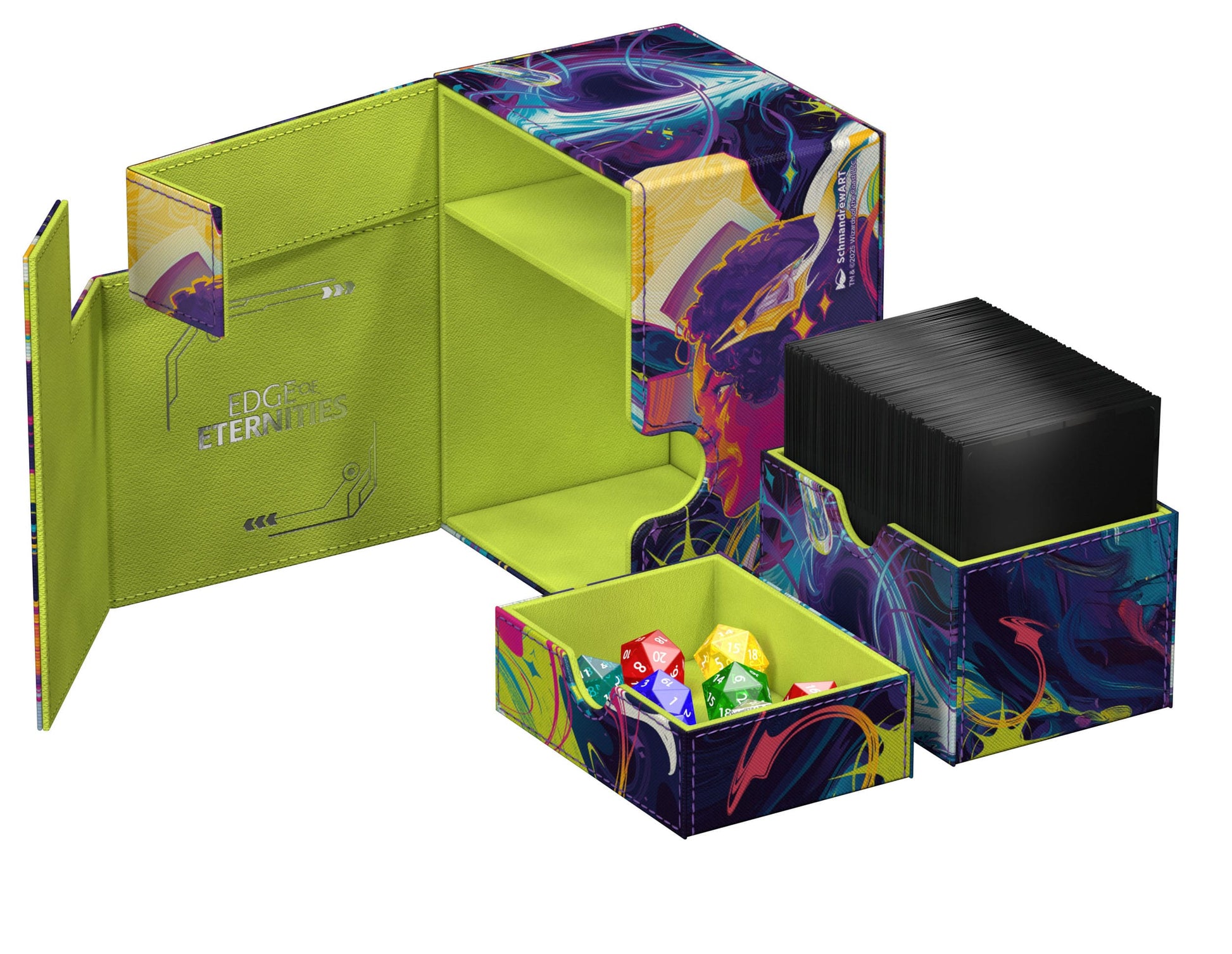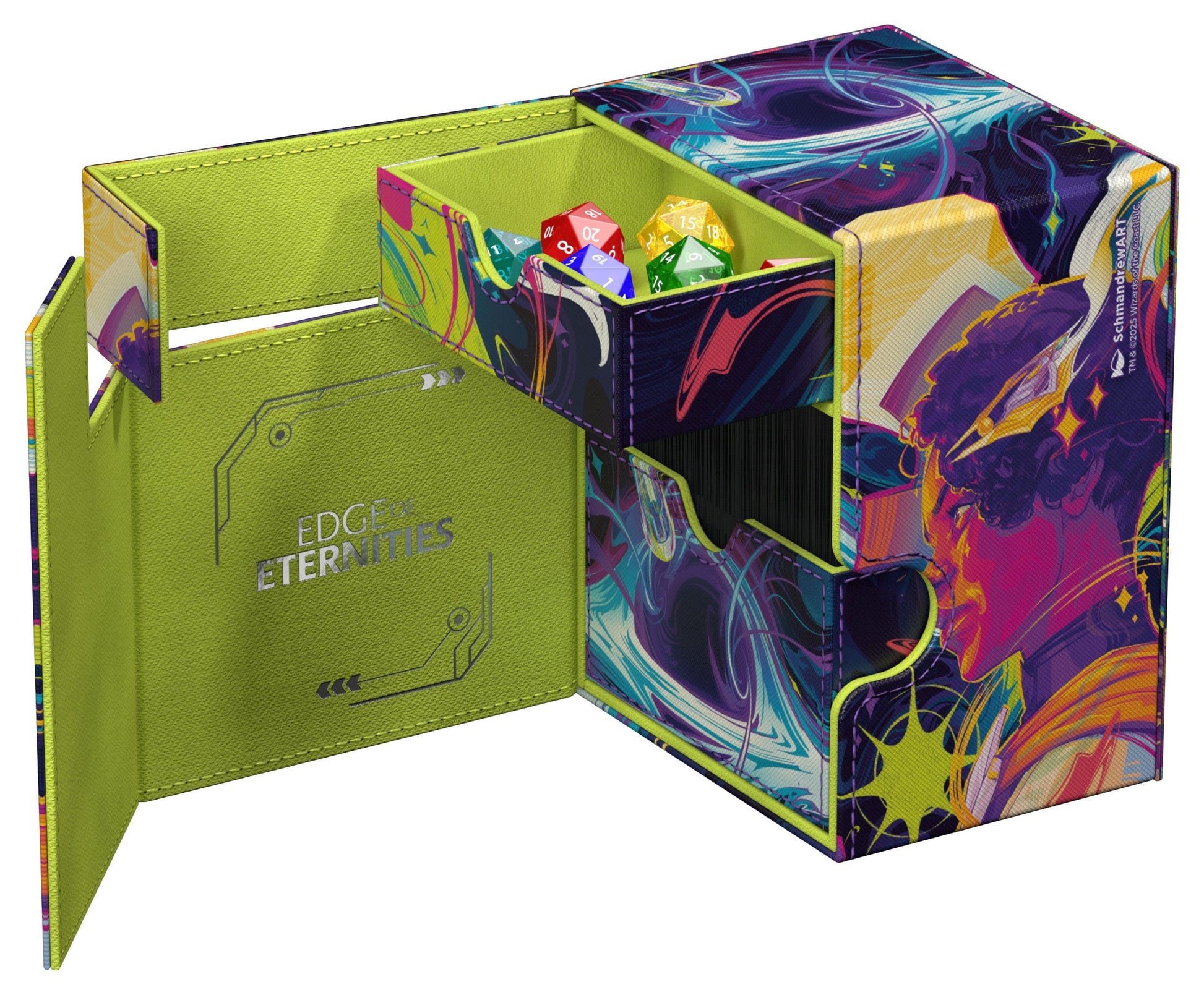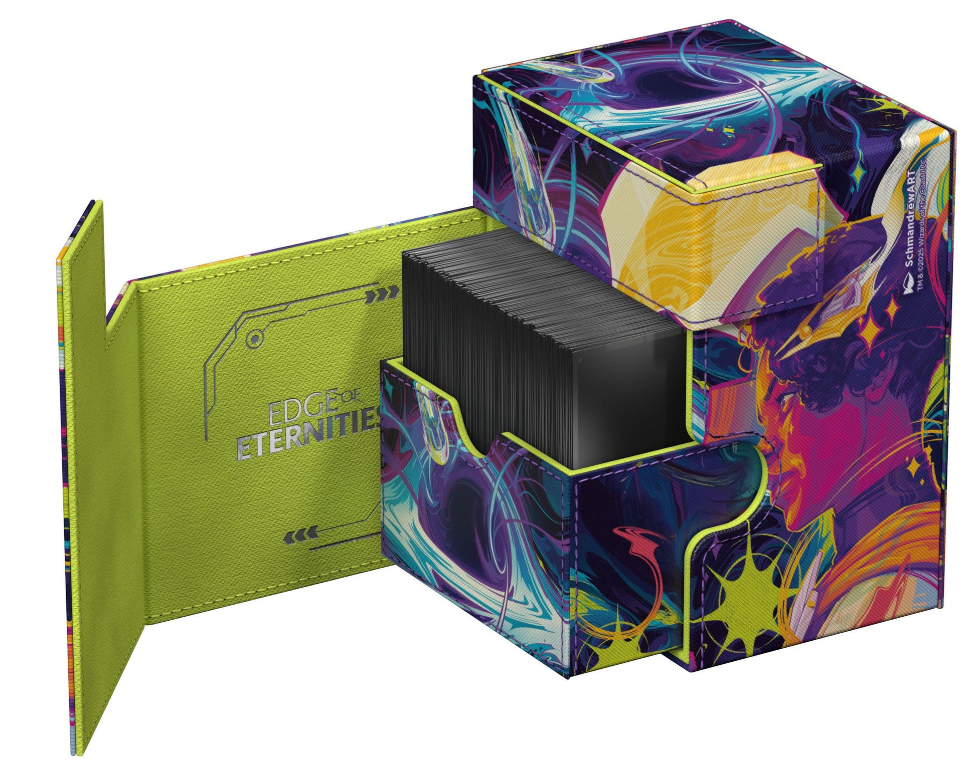 Ultimate Guard's Flip'n'Tray 133+ Xenoskin meets officially licensed artwork from Magic: The Gathering for the first time: The "Edge of Eternities"-style deck box, made of full-color printed, resistant Xenoskin material, not only offers space for 133 double-sleeved cards in Ultimate Guard sleeves, but also an integrated and removable dice tray. The Flip'n'Tray 133+ Xenoskin is the perfect deckbox for Commander/EDH decks and features reliable and strong magnetic closures for safe storage of cards and accessories.