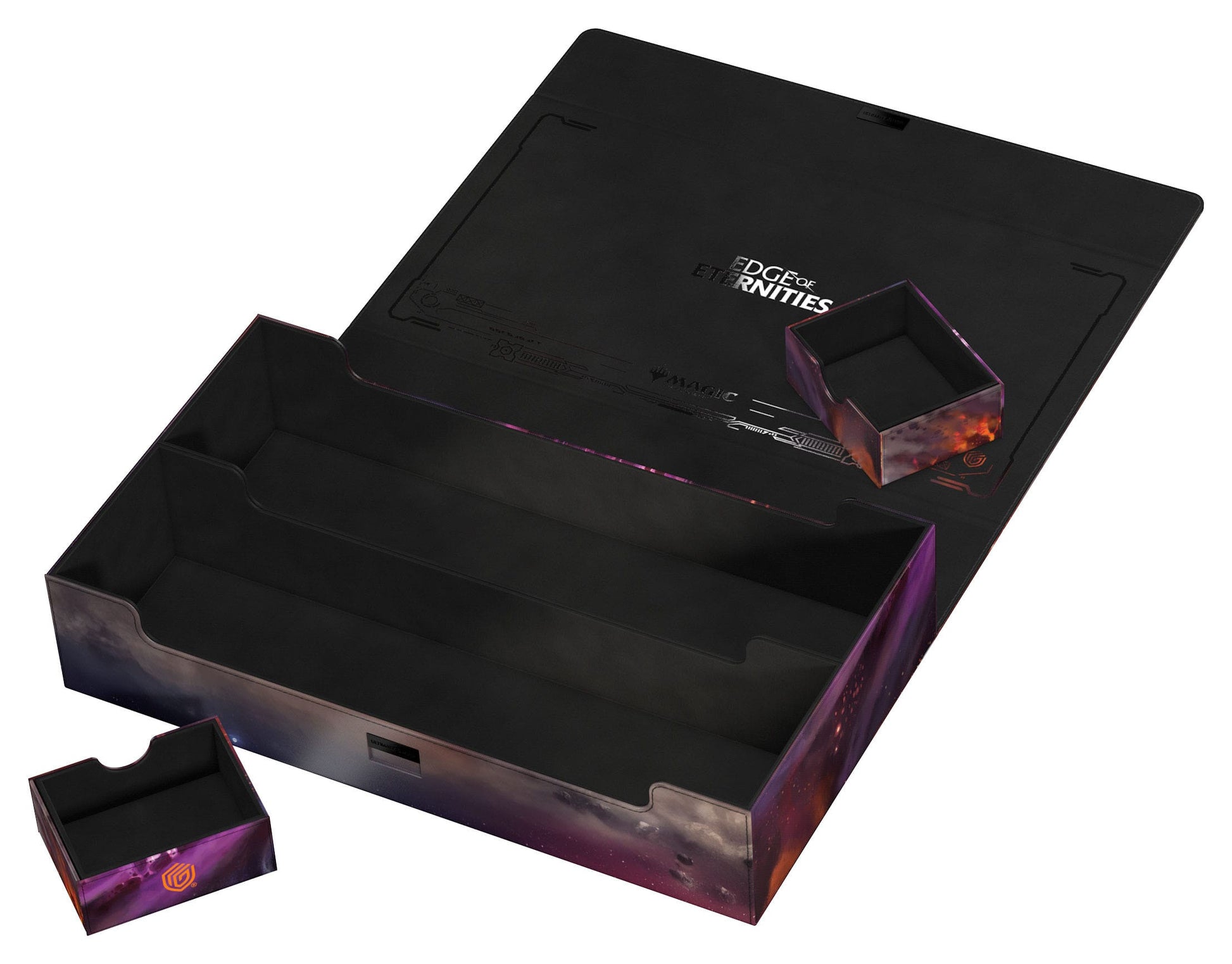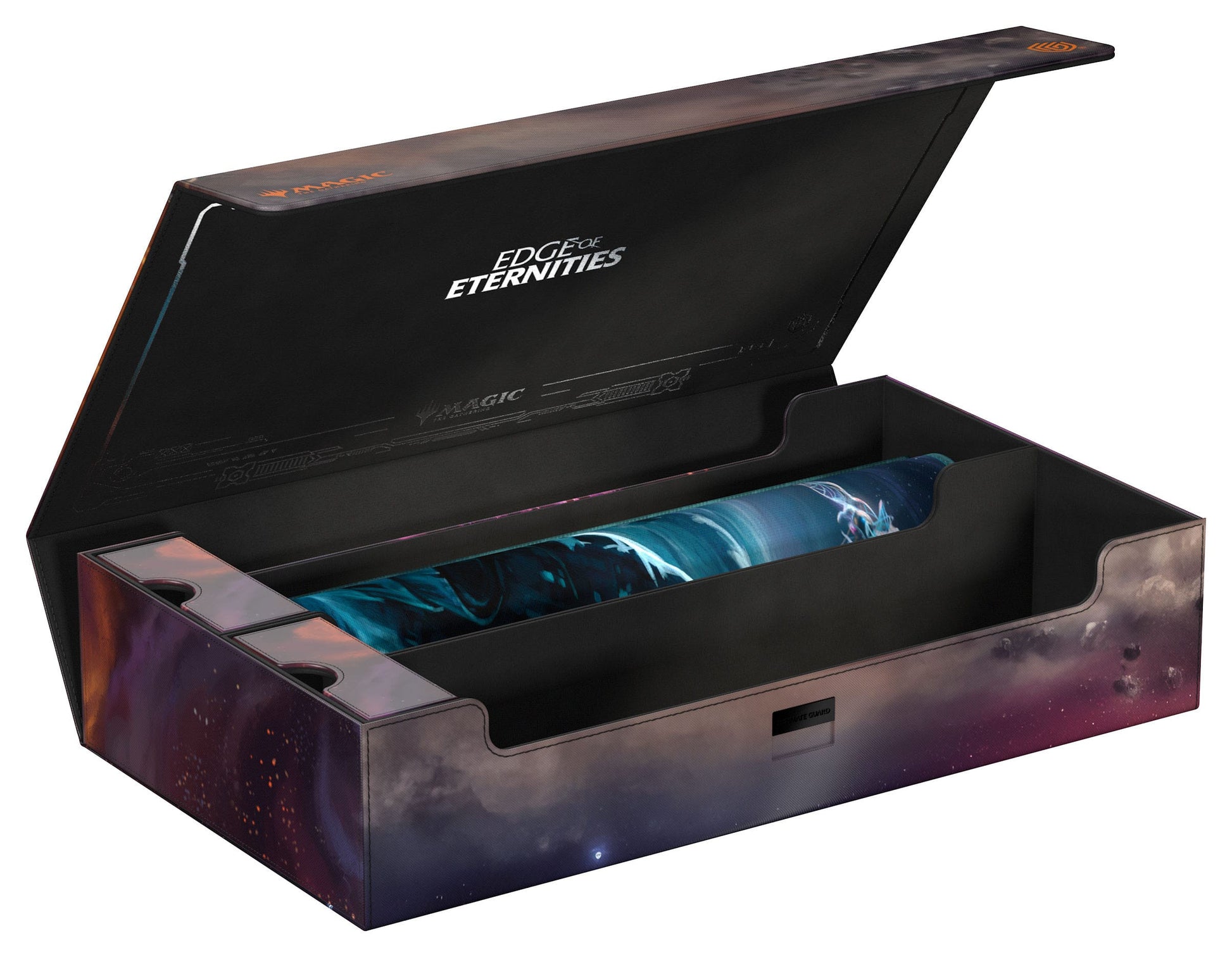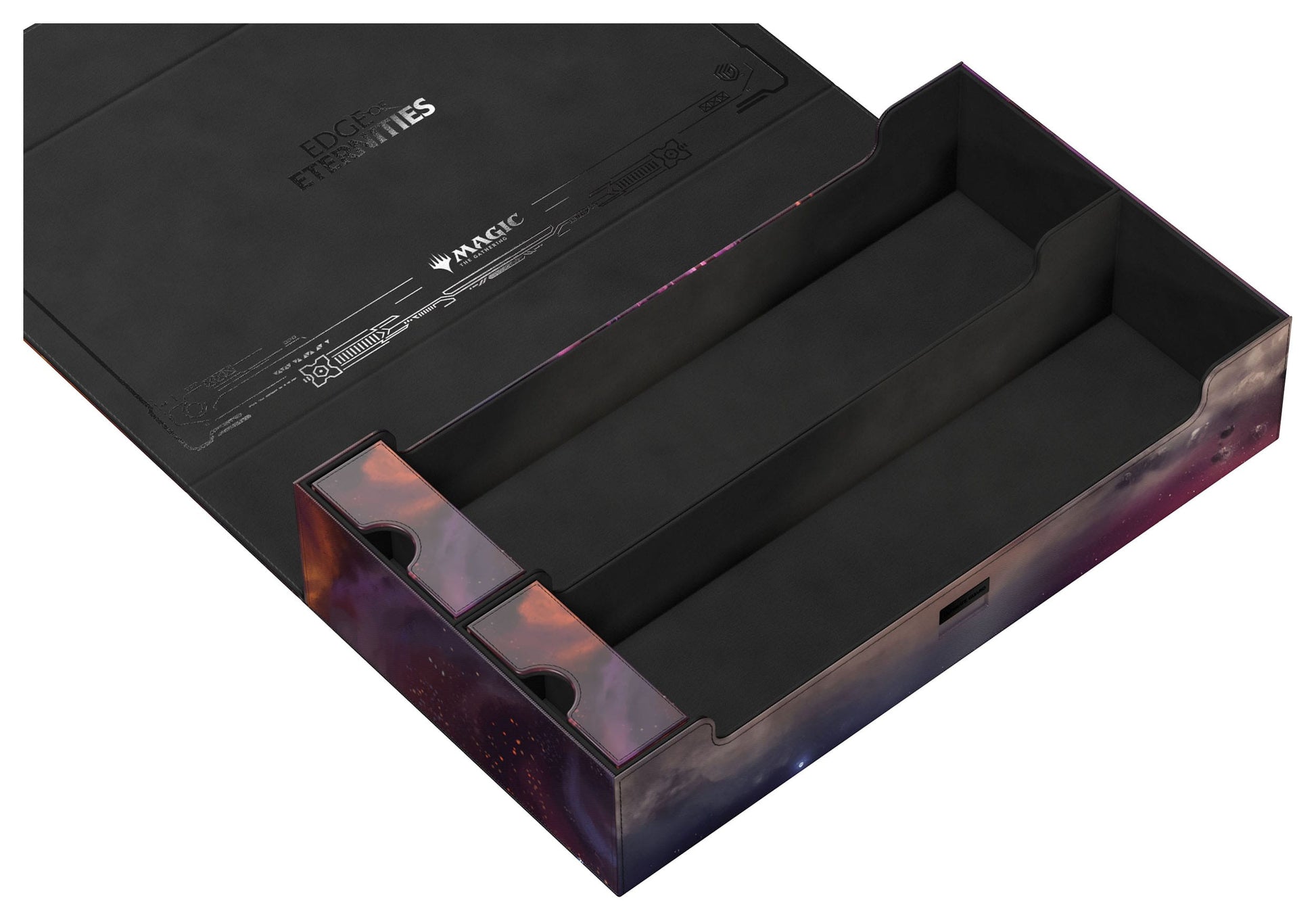 The Omnihive 1000+ Xenoskin, featuring officially licensed MTG art from "Edge of Eternities", is a mass storage box designed to hold multiple deck boxes, dice and/or Play-Mats at once—or alternatively a large collection of single cards (up to 1000 double-sleeved). The two practical and flexibly positionable magnetic trays inside are, like the outside of the box, made of full-color printed and resistant Xenoskin material and have a quality microfiber inner lining. The lid of the Omnihive 1000+ Xenoskin is secured with strong magnets and an additional ZnapClaw mechanism.